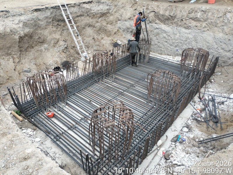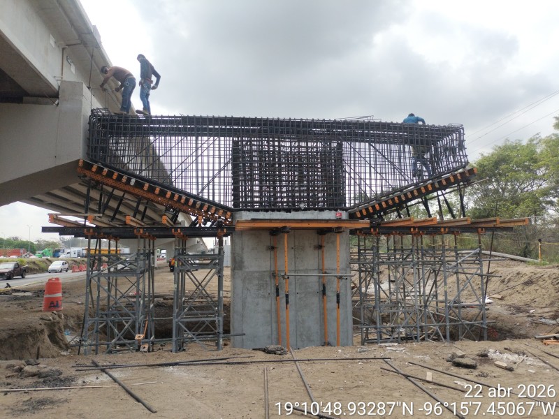 En el cuerpo A, correspondiente al sentido Xalapa–Veracruz, continúan los trabajos de armado de elementos estructurales que servirán como base del puente, así como el avance en la construcción de columnas y cabezales.