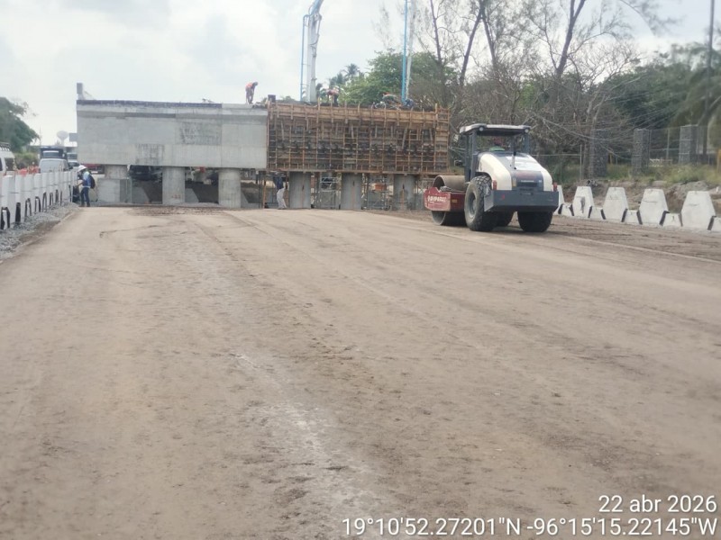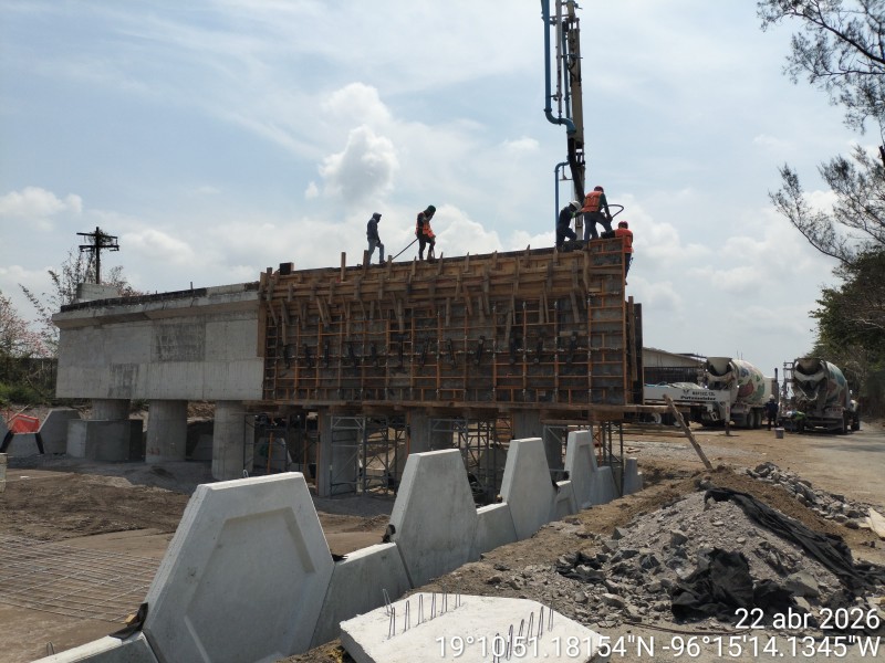 Asimismo, se mantiene el montaje de trabes y paralelamente, se realizan labores de formación de base en la vialidad principal, así como trabajos de terracerías y rellenos en los accesos al puente.