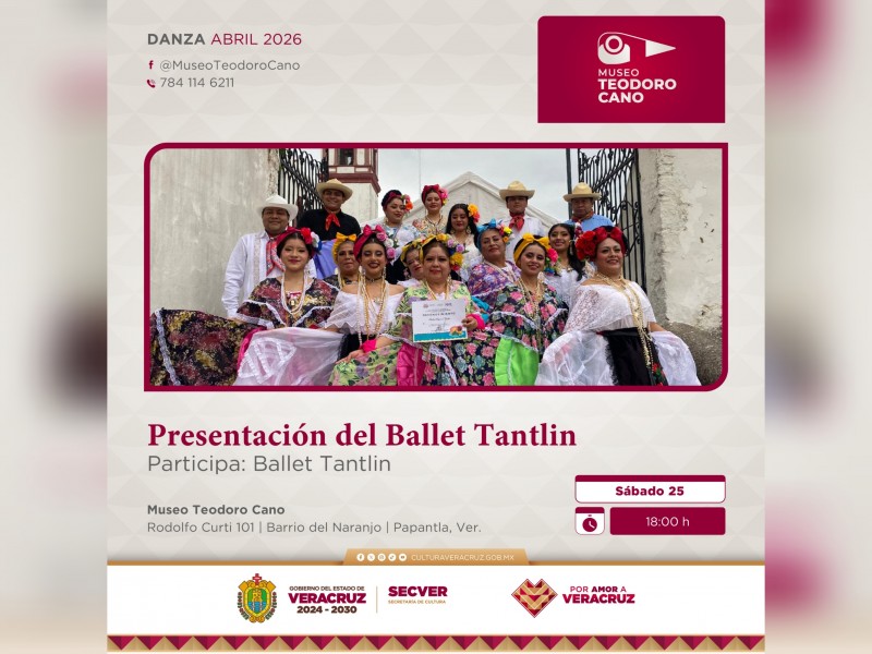 La Secretaría de Cultura de Veracruz (SECVER) invita a la presentación artística del Ballet Tantlin, este próximo sábado 25 de abril, a las 18:00 horas, en el auditorio del Museo Teodoro Cano, en Papantla. La entrada es gratuita.
