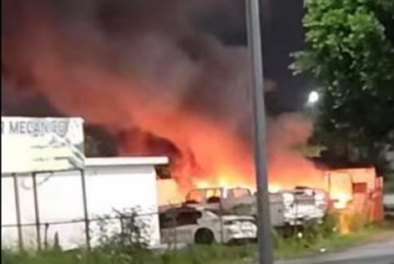 Durante la madrugada se alertó sobre el incendio provocado en un taller mecánico, ubicado en la colonia San Ricardo, dejando daños a varias patrullas de la Guardia Estatal que se encontraban en el lugar.