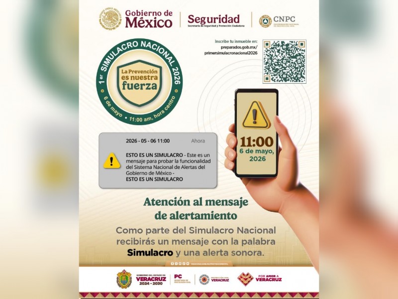 Autoridades municipales informaron que el próximo 6 de mayo a las 11:00 de la mañana, durante el Primer Simulacro Nacional 2026, los habitantes recibirán un mensaje de alerta en sus teléfonos celulares como parte de una estrategia para fortalecer la cultura de la prevención ante situaciones de emergencia, por lo que exhortaron a la población a estar atenta y no caer en psicosis.